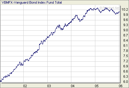 In stark contrast is the five-year chart for VBMFX fromProphet.net, which is available at the AAII Web site. As is shown in Figure 2, this chart shows prices in a steady climb from around $6.00 in early 2001 to around $10 at the close of 2005. While the Prophet Web site does not explicitly state that it adjusts its prices for dividend distributions, and therefore does not state their adjustment methodology, we feel that it is safe to say that they do.