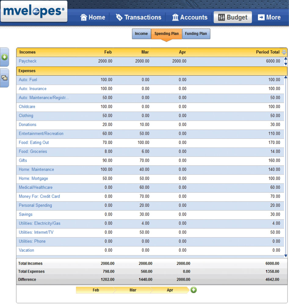 After setting up your accounts, the program asks you to define your income. If you choose to link your account with Mvelopes, the website will automatically update your income accordingly. Is it also a simple process to input income manually. Recurring income options include payments every week, every two weeks, bimonthly, monthly, quarterly and semiannually. Once you are finished setting up your income, start your budget by clicking on “spending plan” at the top of the page. A number of envelopes appear by default. Users may also add envelopes to suit their personal budgeting needs. After designating funds for each of your expenses, the spending plan will update and take the budgeted amounts out of each month’s income.