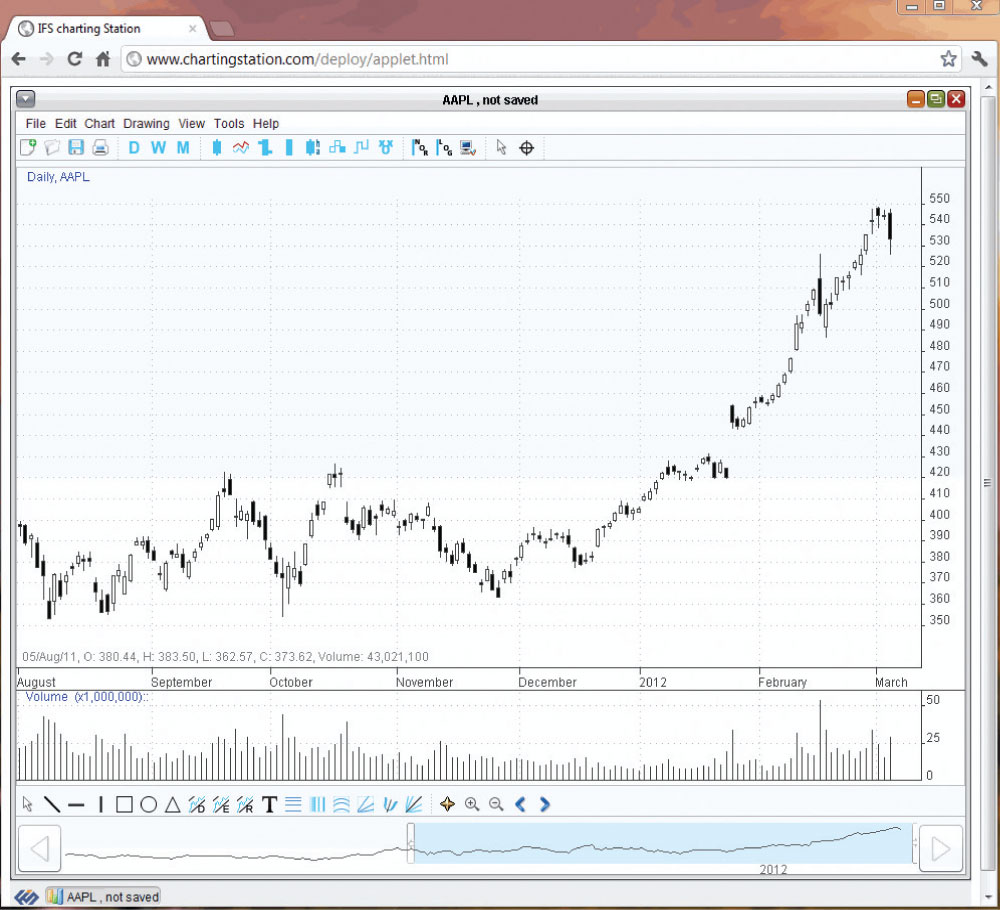 IFS ChartingStation is a technical analysis and charting tool that can run either directly from your Web browser or as a local program downloaded onto your computer. The program has its limitations, but it offers charting capabilities free of charge with no advertisements.