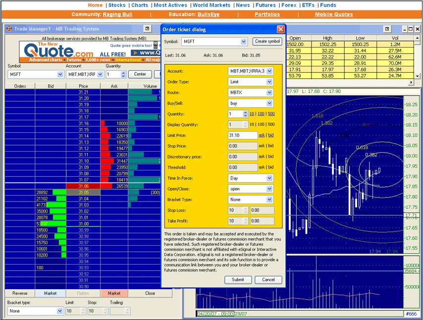 QuoteTrader is free after registration and there are no additional exchange fees associated with trades. After registering with a valid E-mail address, you will receive an E-mail with a link to confirm your registration and download the program. Before you install the program, you must also download and install eSignals Data Manager (www.esignal.com/download/dm/).