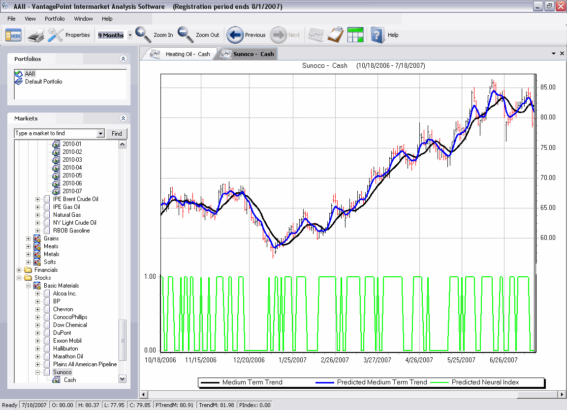 VantagePoint is trading software that helps you identify trends in various markets. Using neural network technology, technical analysis and intermarket analysis, the software finds patterns and relationships between 25 related markets and whichever market you are trading. Users purchase data for their target market and VantagePoint analyzes that data along with that of 25 related markets to try to identify current trading trends. Using pattern recognition, VantagePoint gives predictions for short-term, medium-term and long-term moving averages up to four days in the future. These indicators, patterns and data are presented on charts.