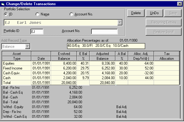 The program requires only deposit, withdrawal and balance information to calculate portfolio rate of return. Automatic allocation of deposits and withdrawals between equity, fixed income, cash equivalents and cash is provided for those portfolios that are designated to employ asset allocation. Rate of return calculations for such portfolios show the performance of each asset classification as well as the total portfolio.