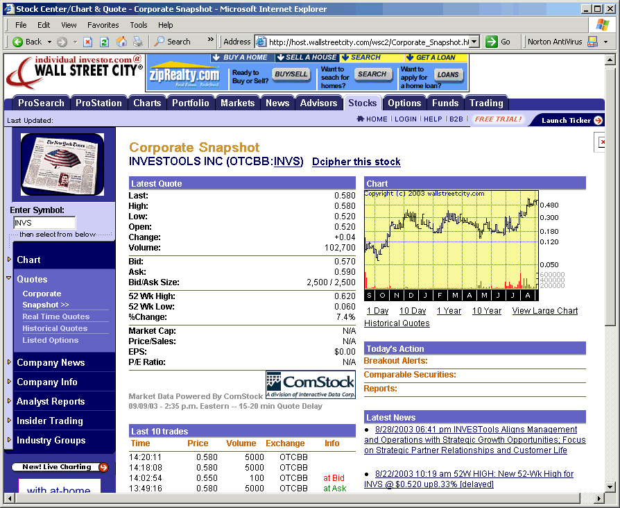 Free tools include portfolio management, real-time and historical quotes, charting, news, Zacks earnings reports, analysts ratings, and basic screening. Multiple portfolios can be set up to retrieve portfolio news and price alerts (which can be received via E-mail), quotes and more. Company news from Reuters and Comtex is available. A keyword search of these resources can retrieve articles of interest. Stock reports are detailed and include standard data from the income statement, balance sheet, and cash flow statement.