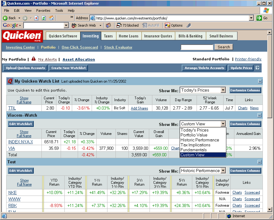 Quicken.com is in the process of changing from a free, stand-alone investment Web site to an on-line extension of its popular personal finance software program—Quicken. Many proprietary Quicken tools are disappearing and being replaced with investment tools from Yahoo! Finance. Past users of Quicken.com have the option of buying or registering a recent copy of Quicken to continue using the Web site, or migrating their portfolio to Yahoo! Finance.
