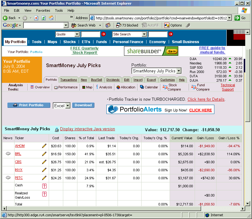 The Smart Money magazine Web site supports two free on-line portfolio managers—a standard html-based on-line portfolio manager and an enhanced tracking tool that utilizes Java technology. Like ActiveX-driven applets, the Java-based tool runs on top of your browser software and allows for more dynamic portfolio tracking and analysis. It also offers more options when it comes to printing out portfolios. The look and feel of this Java-enhanced portfolio tracker is the same on a Windows PC as it is on a Macintosh; nothing is lost in the layout's interface either. At the site, registered users can enter up to 50 portfolios and can easily switch back and forth between the two modules so as not to lose any data or double-enter their holdings.
