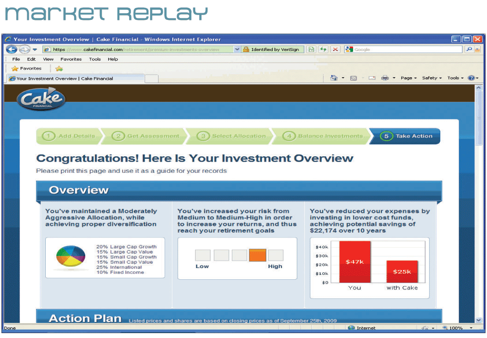 Finally, you can select a new allocation strategy and reallocate your funds based on the new data. Cake Premium suggests new funds and new allocation levels for funds you already hold. You must go through your broker to make the actual changes to your account, but Cake Premium lets you see how the changes will impact your overall portfolio. After you have made changes, you can print a sheet detailing all of the portfolio updates.