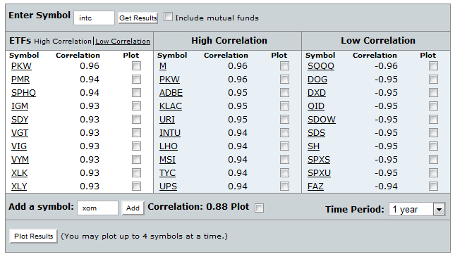 For several years running now, SmartMoney.com has offered the most useful and robust tools. These java-based tools are separated into 17 categories. However, the best tools require a SmartMoney.com Select membership. To navigate to the tools section, click on the Tools tab from the main SmartMoney.com page. There are too many tools to describe in this article, but several are worth noting. The Correlation Tracker is an excellent tool, returning ETFs, mutual funds and stocks that have the highest and lowest correlation to a user-specified security over a customizable time range (Figure 6). You may also select two securities, and the tool will calculate their correlation. The Stock Compare tool allows users to easily compare a bevy of data points for several stocks. Users can also sign up for email alerts for stock news and price levels.