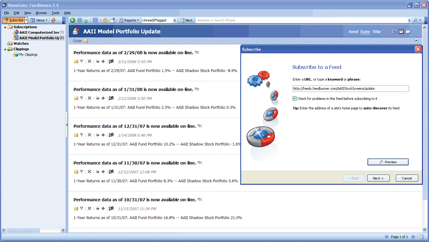 You can use FeedDemon to manage feeds from financial Web sites as well as AAII content, including update feeds for the AAII Journal, Model Portfolios, Stock Investor Pro, Computerized Investing and the Quarterly Mutual Fund Update. Visit www.aaii.com/rss to sign up for AAIIs RSS feeds. First, click the orange RSS icon next to the feed you wish to add. Next, copy the Web address from the browser and paste it into FeedDemon by clicking Subscribe then choosing Ill enter the address and pasting the URL. You can download FeedDemon for free at AAIIs download library in the Utilities category and at the companys Web site.