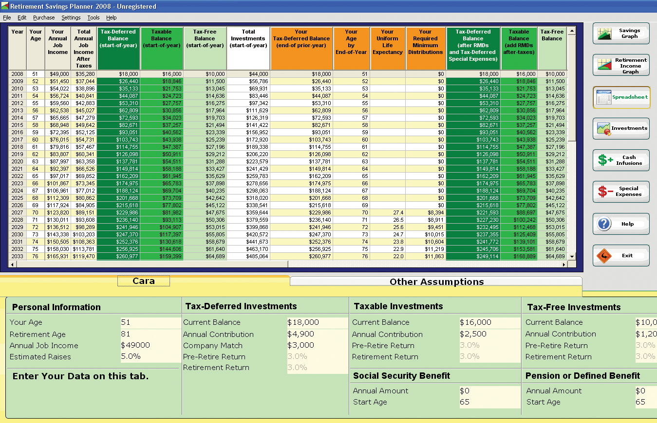 To increase the accuracy of the calculations, the program asks a few more questions about retirement goals, inflation rates, and current and expected future tax rates. Data is then graphed.