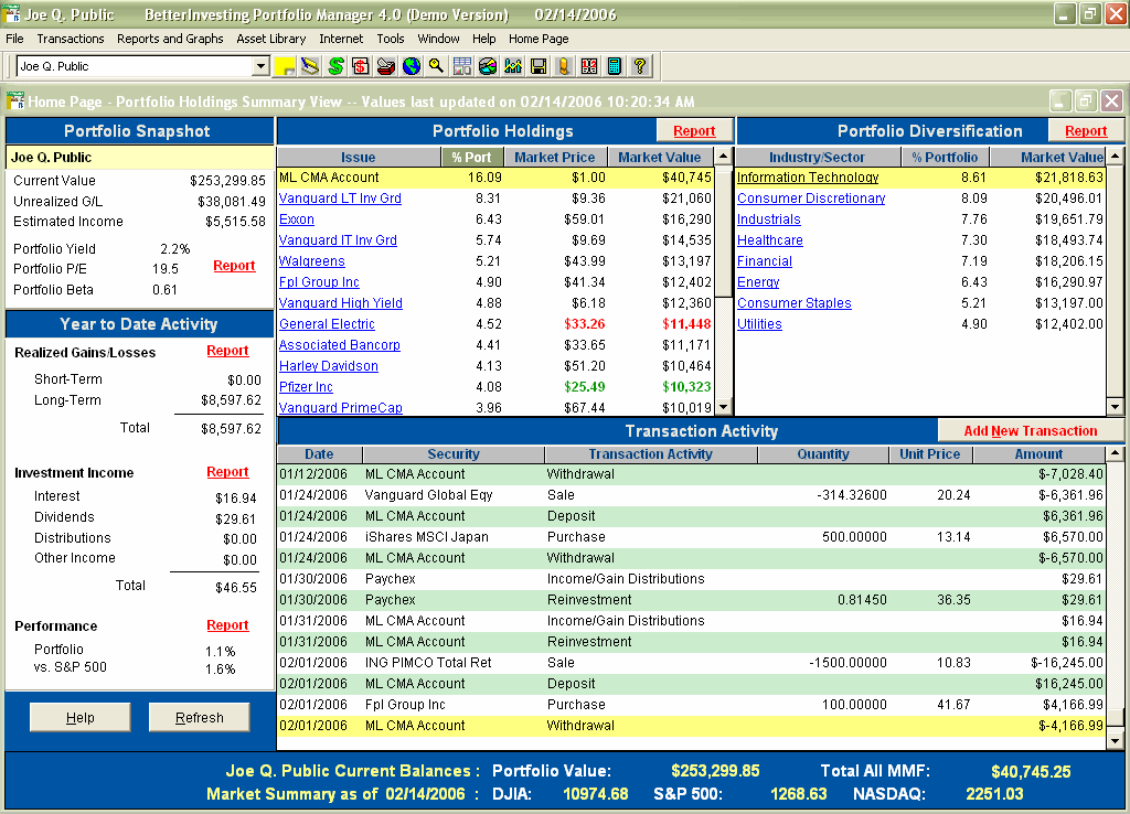 The programs home page screen shows a portfolio snapshot that includes the portfolio price-earnings ratio and beta and year-to-date activity that lists investment income, performance and realized gains and losses. The portfolios current holdings and values, a list of transactions and a breakdown of portfolio diversification are also given. A refresh button allows users to update prices and portfolio values frequently.