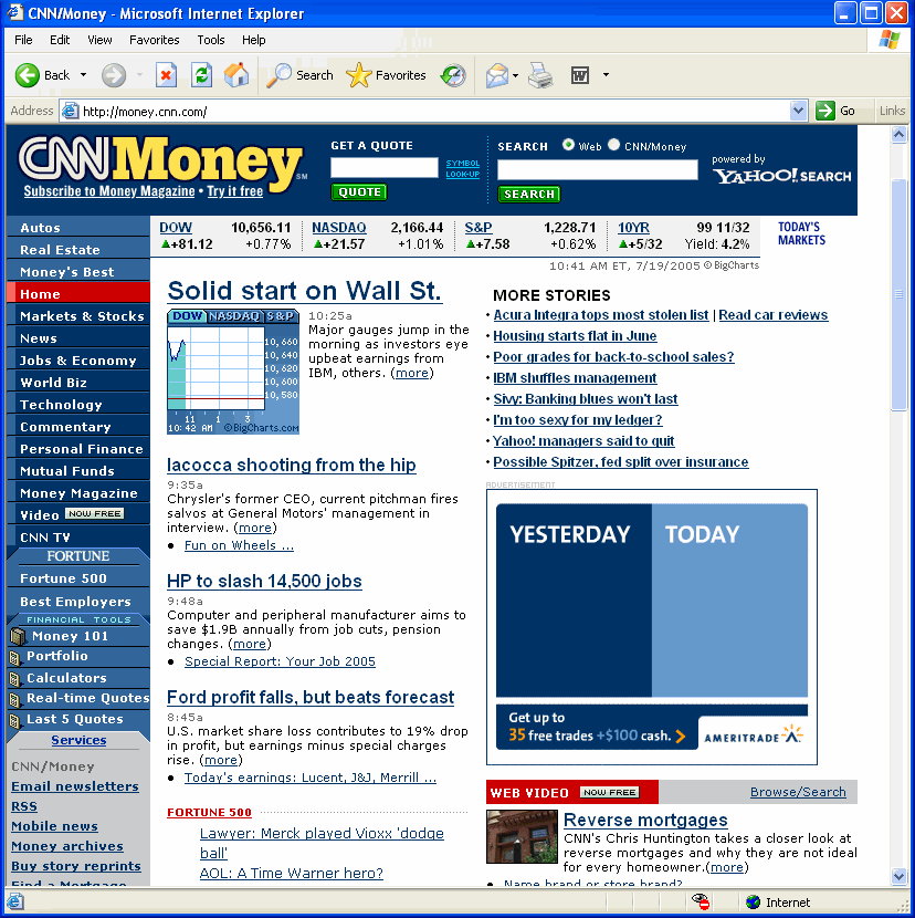 CNN and Money Magazine team up to offer up-to-date news stories, on-line portfolio tracking and analysis tools. In addition to CNN and Money Magazine news stories, users can read news from Reuters, Dow Jones, Market Edge, and Fortune Magazine. While the portfolio tracker is basic—offering the latest stock price, the days percentage change, current market values and 52-week highs and lows—it is adequate for simply following a portfolios movements. All data is delayed by at least 15 minutes. Real-time data is available by subscription only and costs $14.95 per month. Investors can receive E-mail alerts with important news stories on the stocks in their portfolios.