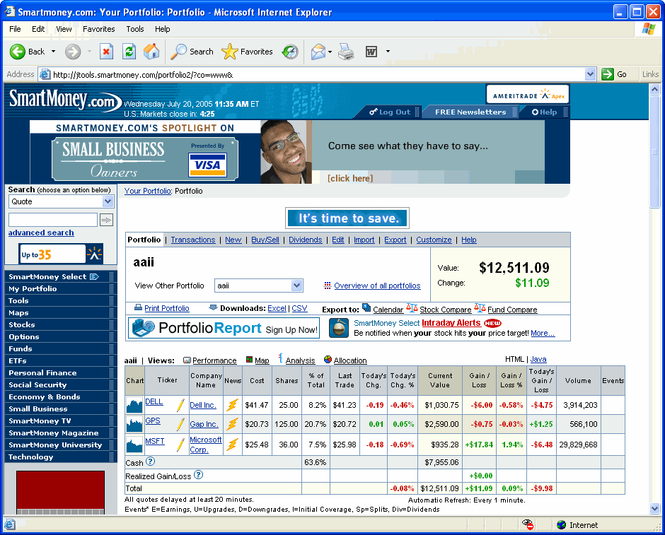 Although the site is not free, for a reasonable price ($9.95 per month; $4.95 per month for print WSJ subscribers) investors can access Wall Street Journal and Barrons articles, stock and mutual fund data and a portfolio tracker. You can create up to five portfolios with up to 30 securities in each with the sites basic portfolio tracking program. The site compares your portfolio performance to the Dow Jones industrial average, the S&P 500 and the NASDAQ composite. You can view the percentage change for the day, the total gain in dollars and the total value of all of your holdings. The site has no mutual fund or stock screening tools.