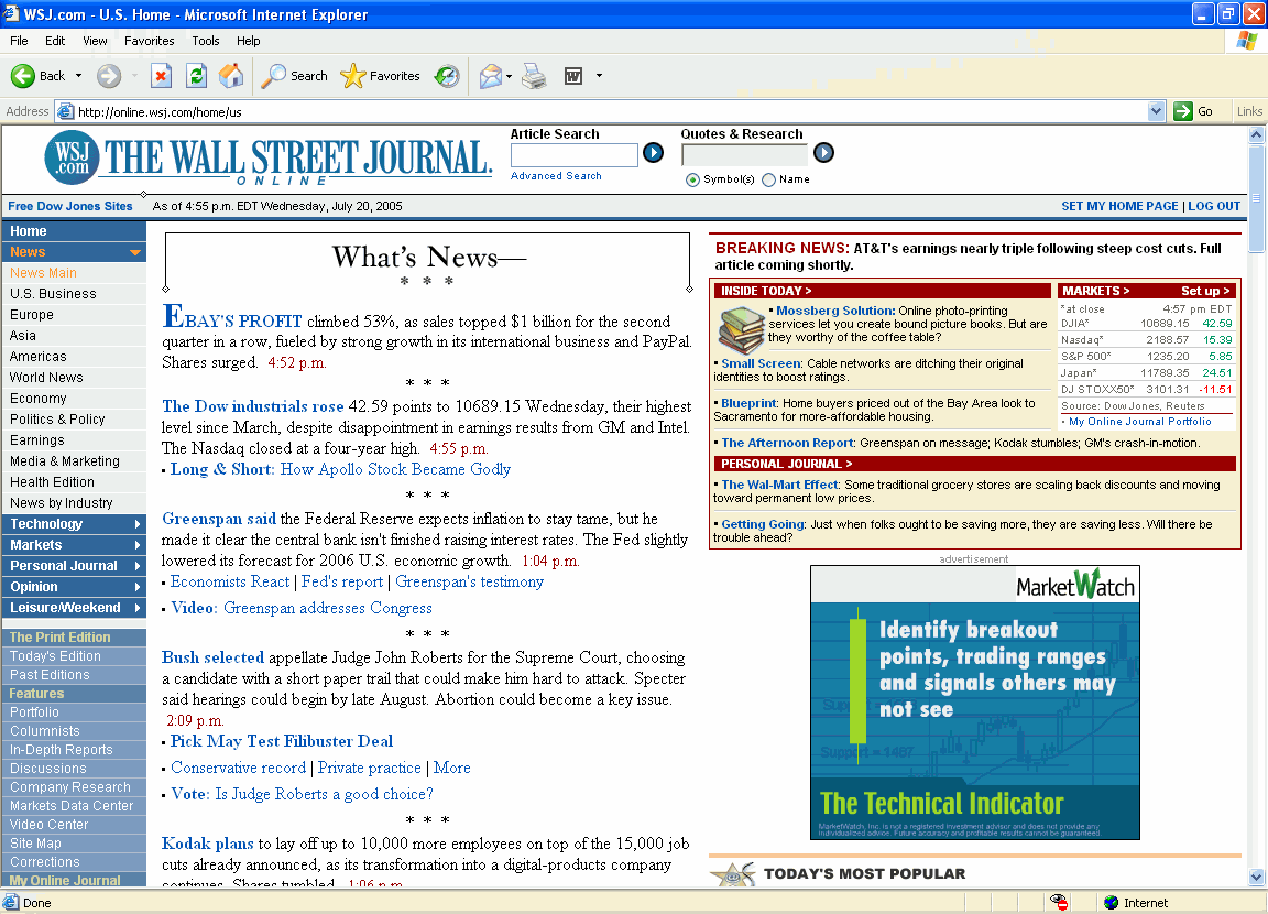 As a member you have access to an archive of old WSJ articles as well as the current days edition (fee for articles older than 90 days). A custom news retrieval option allows users to sift through the large catalogue of articles quickly and find the most relevant articles. Stories can be sent to you via E-mail from the WSJ and Barrons.