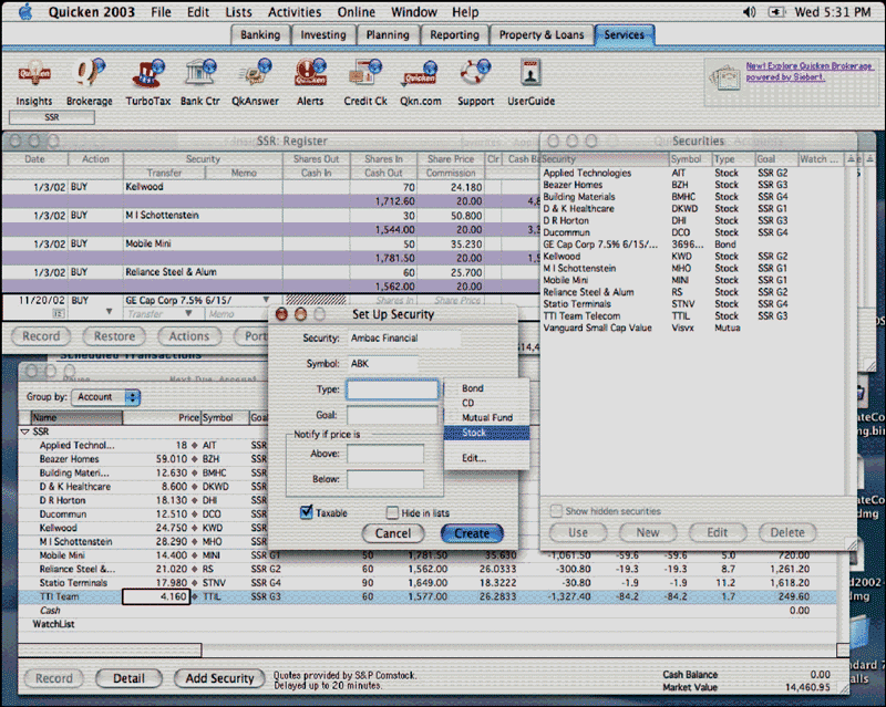 Money tracks a standard set of securities such as cash, stocks, mutual funds, and bonds and the Deluxe version has added an option wizard tool for creating and tracking equity and index options. The program has an exercise wizard that guides you through the process of exercising existing options. Overall, Money handles a fair amount of securities and offers extensive coverage of transactions.