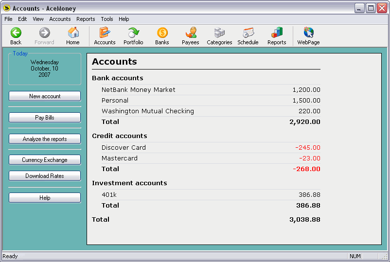AceMoney is a basic personal finance program used to organize and manage finances. The program can manage multiple accounts of different types including checking, savings, credit cards, loans, debt accounts and a user-customized account.