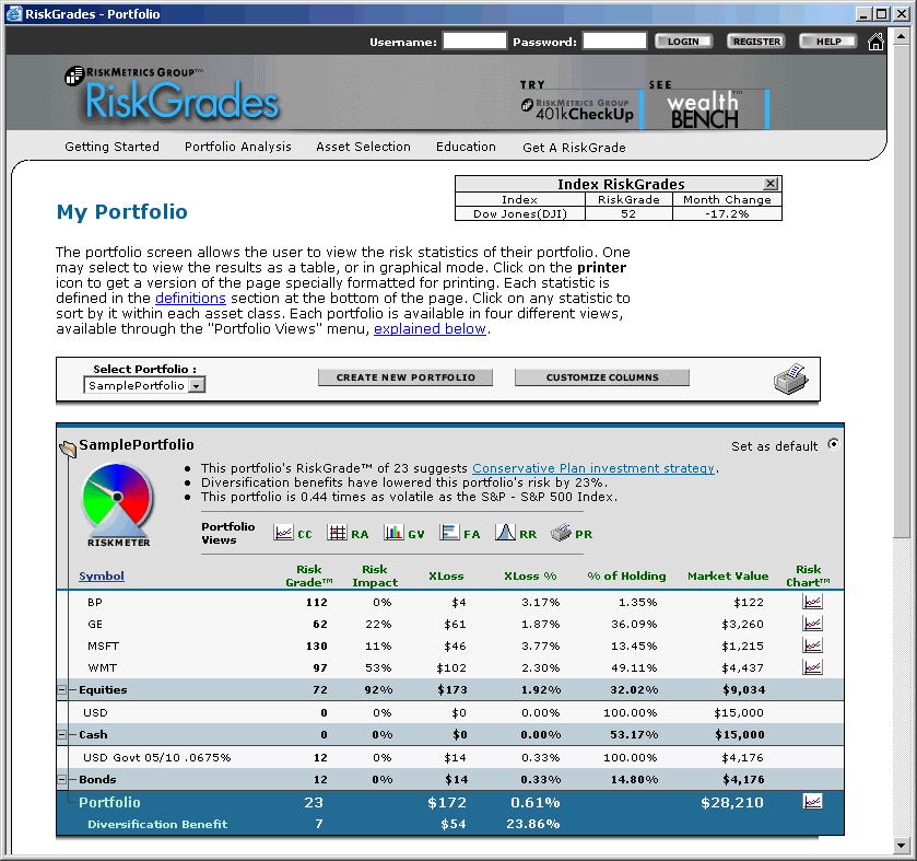 CI Editor Responds: We are not aware of any site that allows you to get correlations between investments. However, we use the RiskGrades Web site (www.riskgrades.com) extensively to build portfolios of assets that have the greatest diversification, creating risk-minimized portfolios. With MPT, the risk of a particular asset is not nearly as important as how that particular assets price varies in relation to the other assets in the portfolio. With the RiskGrades Web site, which is free, you are able to see how adding or removing assets from your investment portfolio will affect the portfolios overall volatility (risk). For more information on how to use the RiskGrades Web site, see the Feature in the May/June 2003 Computerized Investing, available in the CI archives at AAII.com.