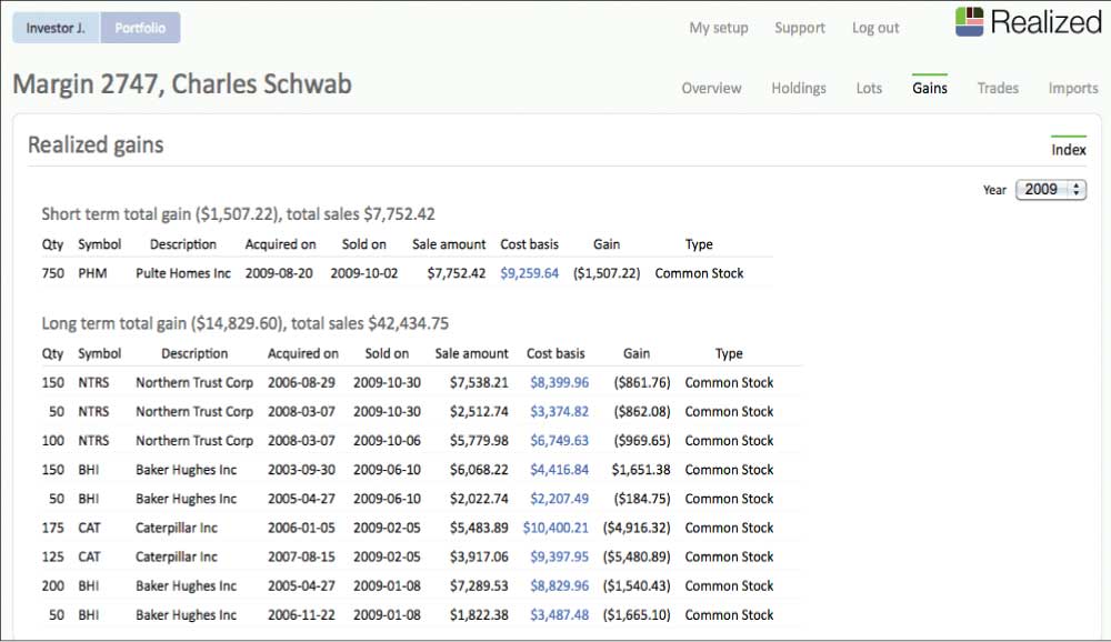 If you set up multiple portfolios for multiple brokerage accounts, the site can display your long- and short-term gains across all portfolios. It will also alert you if a transaction in one portfolio would trigger the wash-sale rule because of holdings in another of your portfolios. The site can generate a Schedule D at any time.
