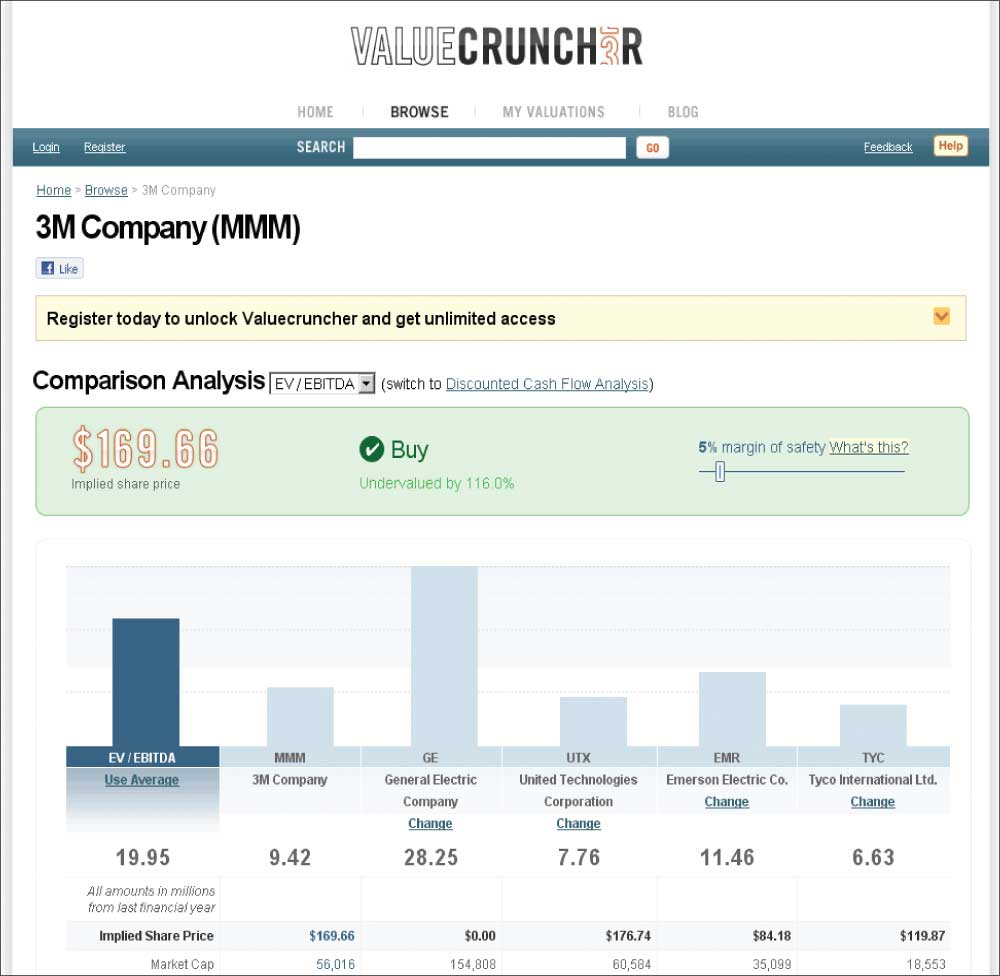 To bring up a stock’s valuation and associated statistics, you can type the company name in the search box or choose a company name from the most popular list or from one of the browsing lists. The current default screen when a company is chosen is a new feature called comparison analysis, which shows you the stock’s enterprise value to earnings compared to four other similar companies. You can substitute these comparison stocks for any company in their database, which covers over 9,000 stocks.