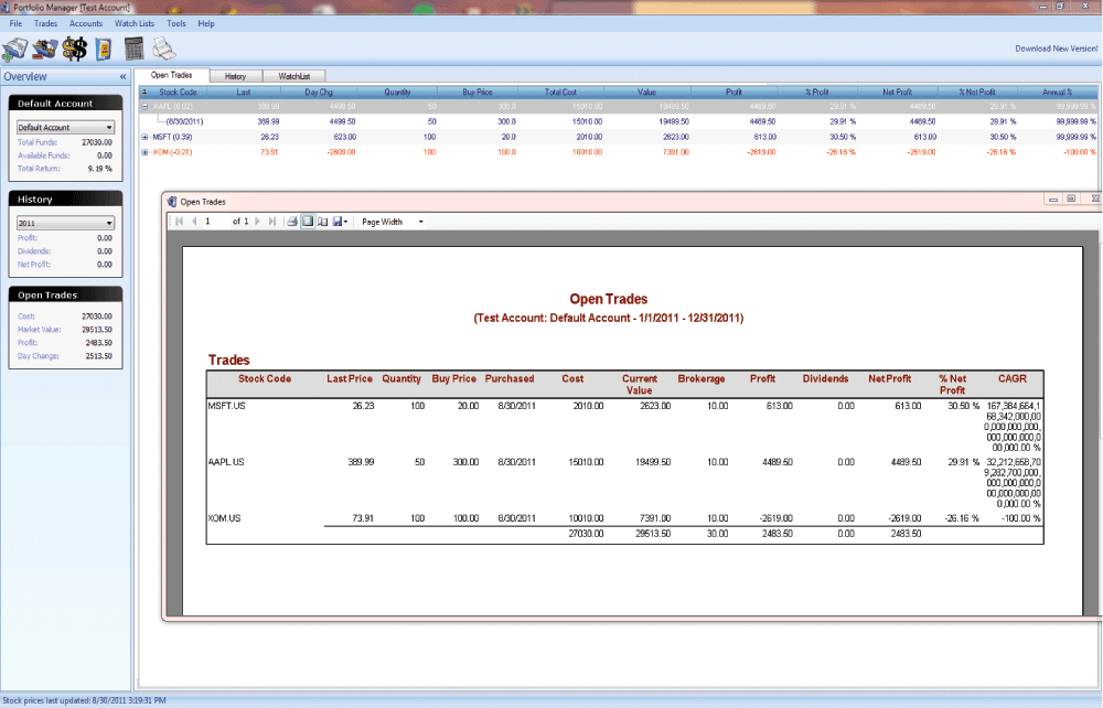 Overall, the program is simple to use and does an adequate job of keeping track of your investment holdings. Portfolio Manager costs $29.95, and you can download a free 30-day trial.