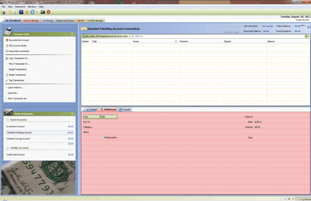 My Money’s home page includes six tabs by default—four for personal finance, one for investment management and one with a calendar. The checkbook records the details of the checks you write. You can manage your bank accounts, bills and deposits, all from the account manager. The list manager tracks your payees, transaction categories and financial institutions.