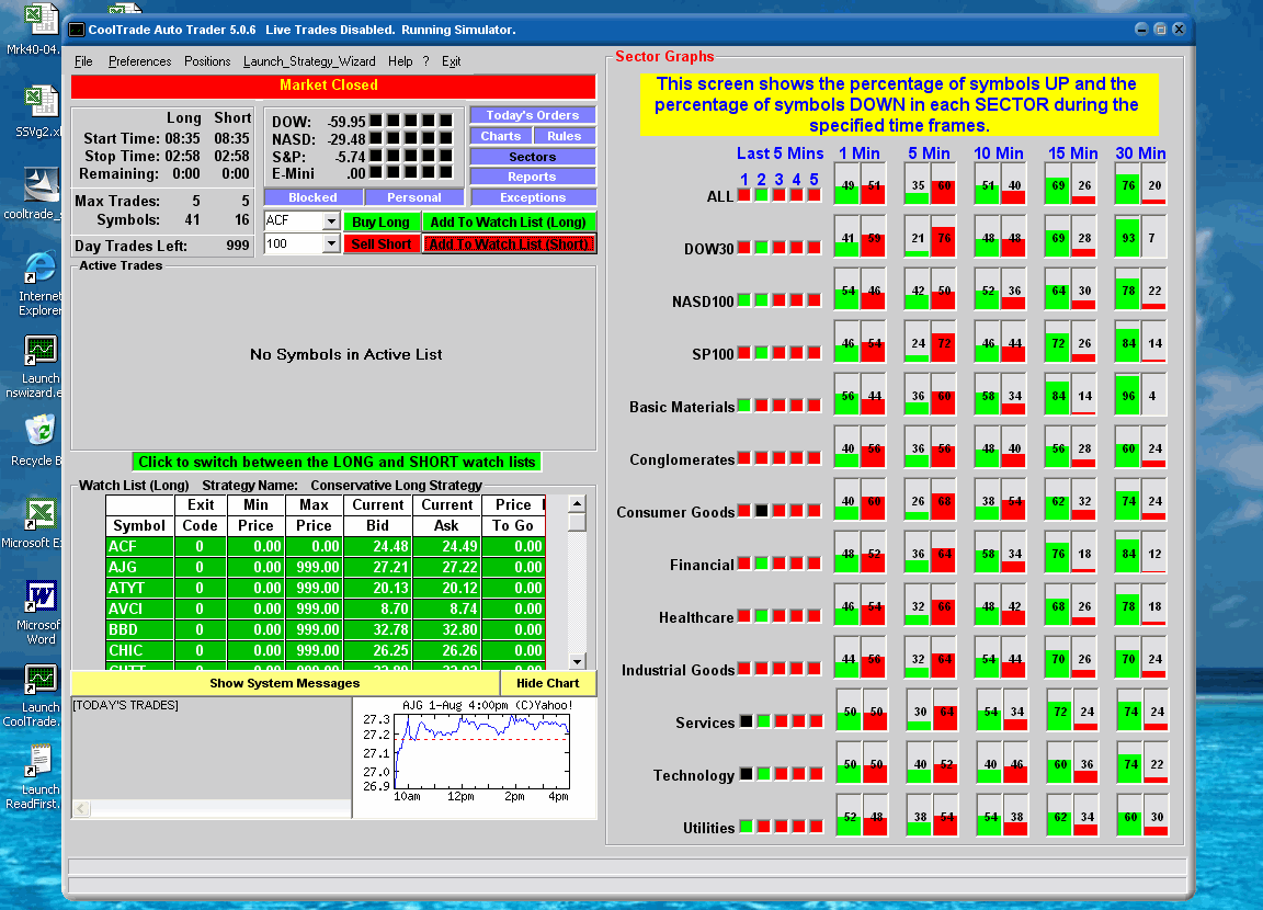 The CoolTrade Automated Trader runs your strategies on its own, executing trades robotically. The system monitors the market from open to close making trades throughout the day. Reports can be generated summarizing trades and profits.