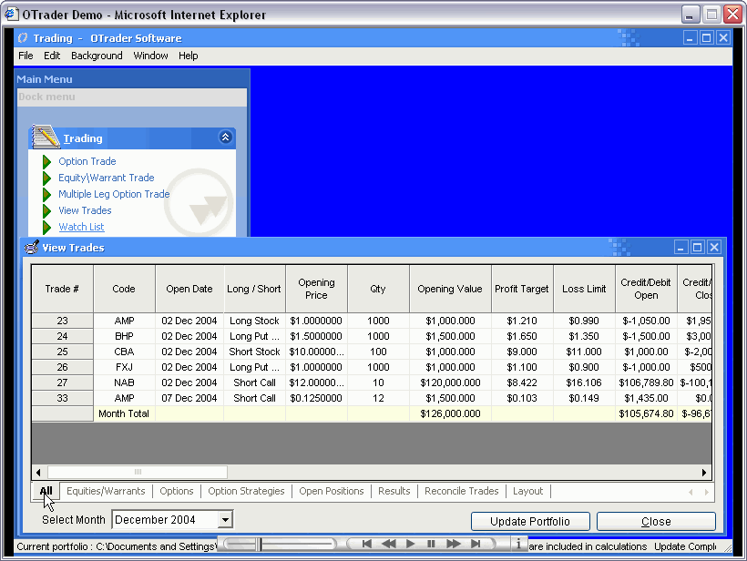 OTrader Portfolio OTrader 4.1 is a portfolio management tool for stock, options, warrants and futures traders. The program allows you to plan trades before placing capital at risk, use the trading plan checklist to try to improve trading discipline and potential returns, and review your trades. You can manage trades with stop losses, profit targets and end of financial year reporting.