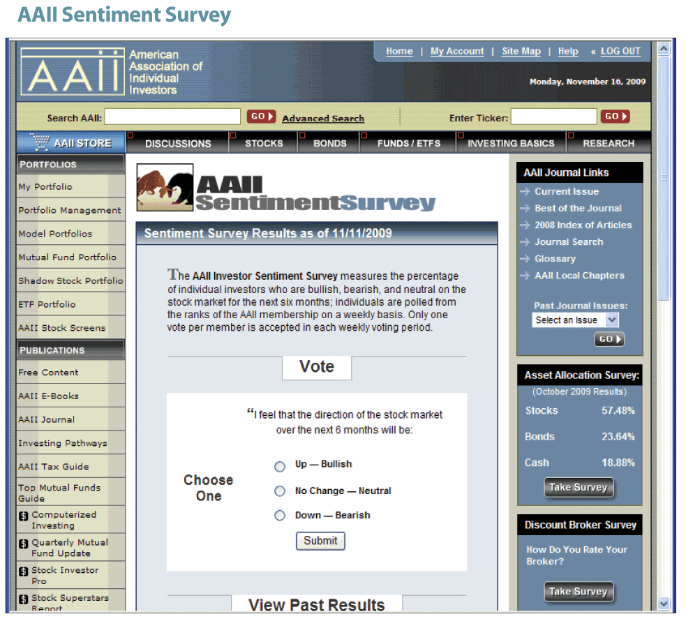AAII’s Sentiment Survey measures the percentage of individual investors who are bullish, bearish, and neutral on the stock market short term; individuals are polled from the AAII Web site on a weekly basis. Results are also presented in AAII’s twice-monthly CI E-newsletter. You can also download historical data going back to 1987.