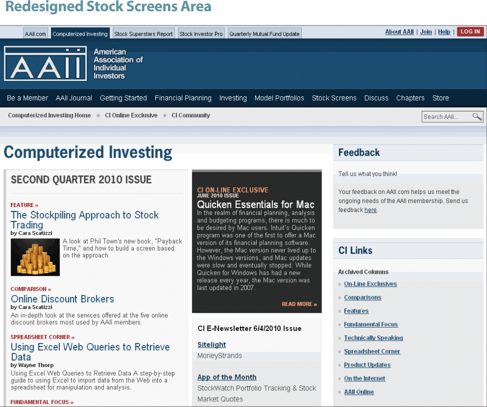 The “new” Computerized Investing (CI) area of AAII.com (www.aaii.com/ci) is also easier to read with more graphics, larger text and links to related articles. Recent print issues and online exclusives are featured prominently. In addition, you can access past online exclusive articles and issues of Computerized Investing easily and quickly. Past columns are archived by topic as well as publication date.