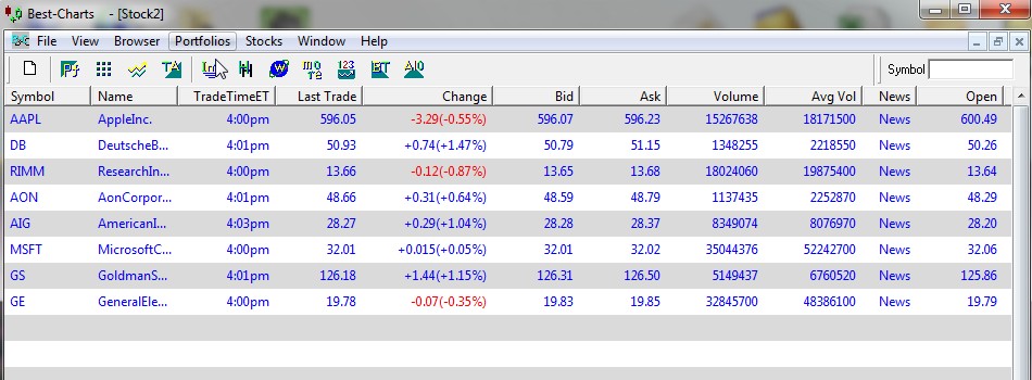 Among the best features of Best-Charts is that the program allows users to create up to 20 portfolios that can each hold and monitor up to 40 stocks simultaneously. To set up a portfolio, click on the Portfolios tab, select Edit List, and select a list to edit/create. Here, you can change the list name and enter up to 40 tickers (separate tickers with spaces).