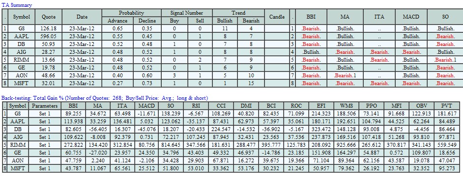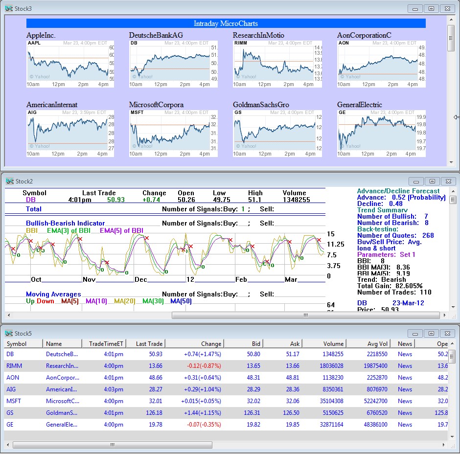 To get more detailed data on a particular stock in the portfolio, select the stock and click the Intraday TA Indicators button located to the right of MicroCharts. This will open a variety of charts regarding the selected stock. To display a TA summary of every stock in the portfolio, go to the Portfolio tab and select “Analyze 40 stocks (quotes from web)”; this should take a few minutes to load.
