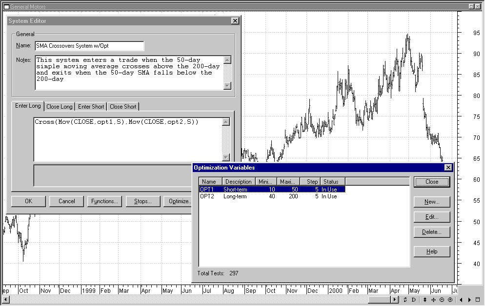 After examining this test, it’s clear that our system must be improved in order to trade in the real world. Otherwise, we would be better off investing our money in a savings account. Our next step then is to optimize the system to find those moving average lengths that generate the largest gains for General Motors. In MetaStock, you are able to substitute initial values, such as the 50- and 200-day moving averages, for optimized values, which the program will then test for you.