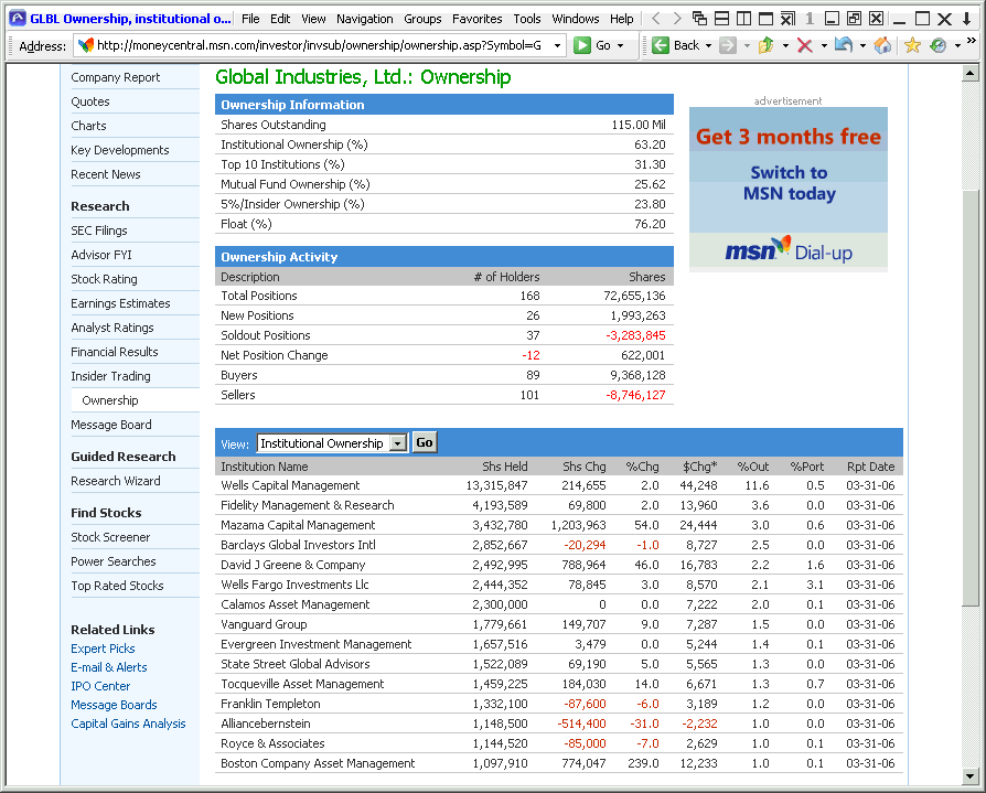The MSN Money website provides a good collection of institutional ownership data, as Figure 6 shows for Global Industries. According to this report, Global Industries has 168 total institutional owners that hold 63.2% of the company’s outstanding shares. The number of institutional shareholders as well as institutional ownership as a percentage of shares outstanding for the other watchlist companies is as follows: