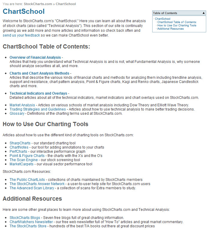 StockChart.com’s ChartSchool is invaluable for beginner investors, those looking to brush up, and those exploring new strategies. Readers will be surprised to find that ChartSchool goes beyond technical analysis education. ChartSchool provides in-depth information on trading strategies, overlays, indicators, chart basics, market analysis, trading rules and guidelines, and more.