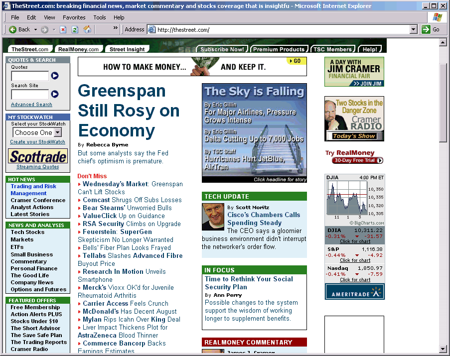 TheStreet.coms home page provides links to a rich array of market news stories, a directory of market commentaries and current personal finance articles, links to research tools, as well as links to the other sites within TheStreet.coms empire. There is a strong emphasis on market movements, stocks in the news, and sectors to watch.