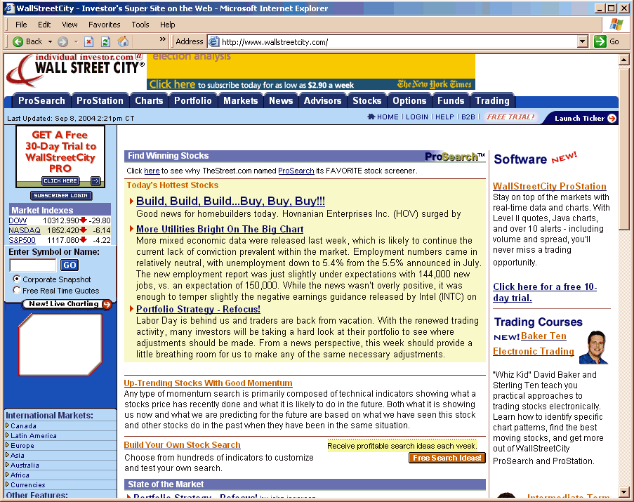 Wall Street City is a comprehensive investment Web site that offers a wide selection of data analysis tools. Free tools include portfolio management, real-time and historical quotes, charting, news, Zacks earnings reports, analysts ratings, and basic screening. Multiple portfolios can be set up to retrieve portfolio news and price alerts (which can be received via E-mail), quotes and more. Company news from Reuters and Comtex is available. A keyword search of these resources can retrieve articles of interest. Stock reports are detailed and include standard data from the income statement, balance sheet, and cash flow statement.
