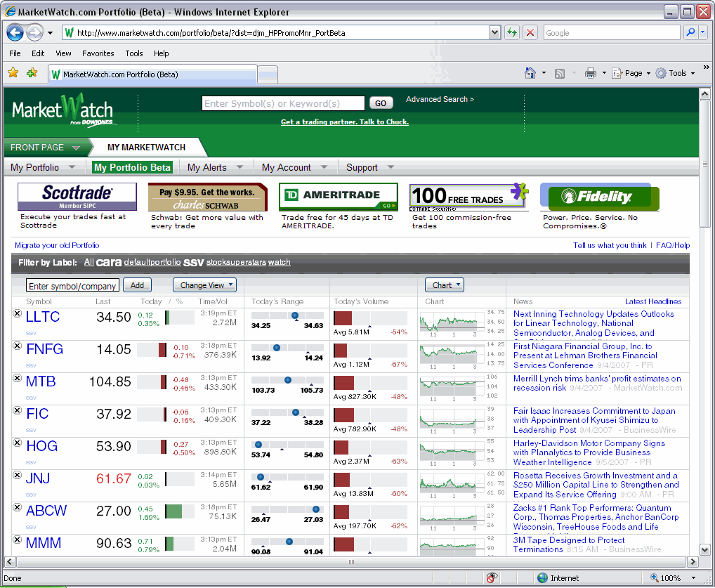 MarketWatch.com is a good site to find news on individual stocks and the market as a whole as well as track your stock and mutual fund portfolios. E-mail alerts regarding portfolio news, price targets and volume information make tracking a portfolio simple. The site provides automatic but delayed price and volume updates on all securities and portfolios. Over 200 statistics are available for each stockincluding earnings estimates, insider information, stock option data, and four years of financial statements. The new Java-based interactive technical charts include 10 years of price and volume data, various technical indicators and the ability to compare multiple securities and indexes.