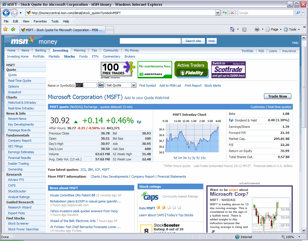 MSN Money offers an impressive set of free stock and fund research and portfolio tracking tools. A downfall of this site, however, is that Macintosh users or those who use a browser other than Internet Explorer (such as Mozilla Firefox) will find the portfolio tracker and stock and mutual fund screeners to be much more limited.