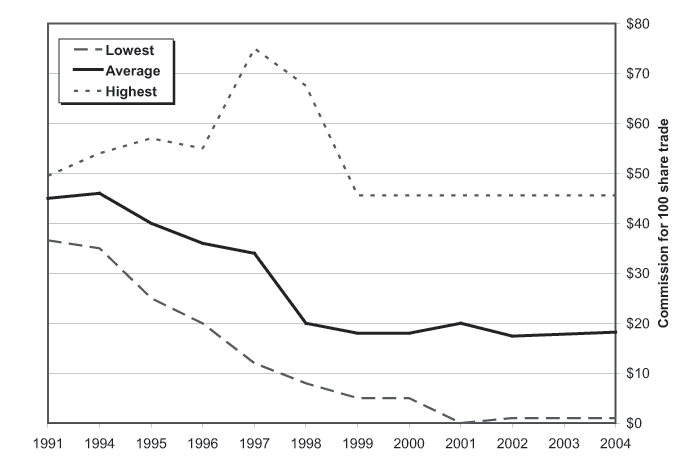 Figure 2 depicts the trend in on-line commissions, displaying the movement of commissions for a 100-share market order charged by on-line discount brokers over the last 13 years. In the early years, when discount brokers first ventured on-line with direct dial-up software, on-line commissions decreased only moderately. However, significant declines in commission charges started to be observed in the late 1990s, with the average minimum commission decreasing from $40 in 1995 to $20 by 1998. For the second straight year, the average commission increased slightly; rising from $17.80 a trade in 2003 to $18.20 this year.