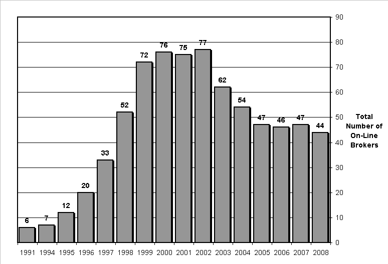The bar chart in Figure 1 traces the growth and subsequent decline in the number of on-line discount brokerage firms over the last 16 years. A big jump took place in 1996, soon after the launch of the first Internet-based broker.