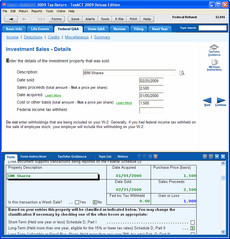The program lists possible sources of income and relies on you to choose the correct type. The program does list the appropriate form next to the income type as the other two programs do. TaxAct accounts for the typical tax-related investment issues but does not offer the ability to import from a broker.
