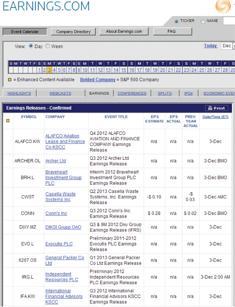 Earnings.com, as the name implies, focuses on company earnings information, providing the actual earnings announcement as well as the consensus earnings estimate and the previous year’s earnings (Figure 2). Projected earnings dates are reported as well as earnings releases going back seven months.