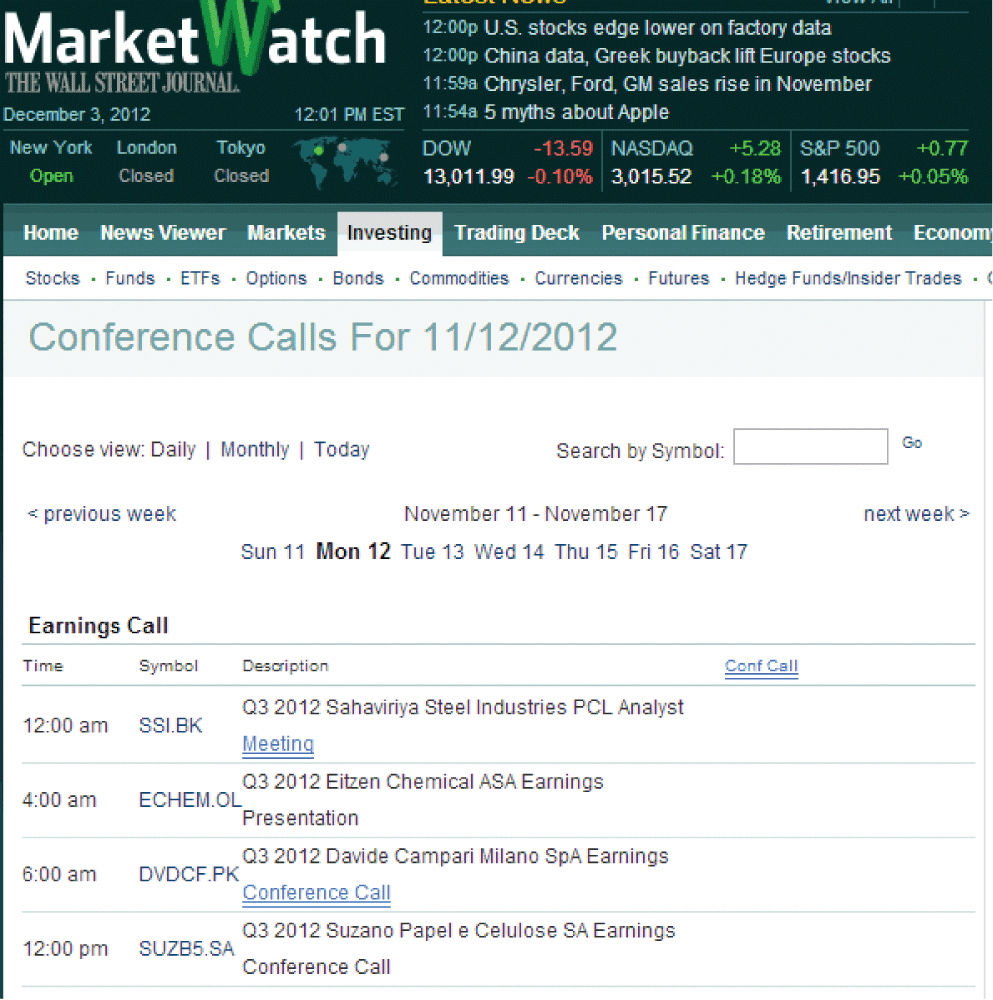 The earnings calendar provides separate entries for confirmed releases and proposed releases. Confirmed release dates are usually set, unless a company changes it due to an unforeseen situation. Proposed release dates are generally projected for about three months after the current earnings announcement and are subject to change. The conference call calendar shows the time and company as well as a short description of what can be expected to be covered (Figure 3). A link to the call is provided if available. Archived earnings releases and conference calls are also available. Finally, MarketWatch.com provides a daily list of upgraded and downgraded stocks, including changes in target prices. The website also offers a quick explanation of the ratings change.