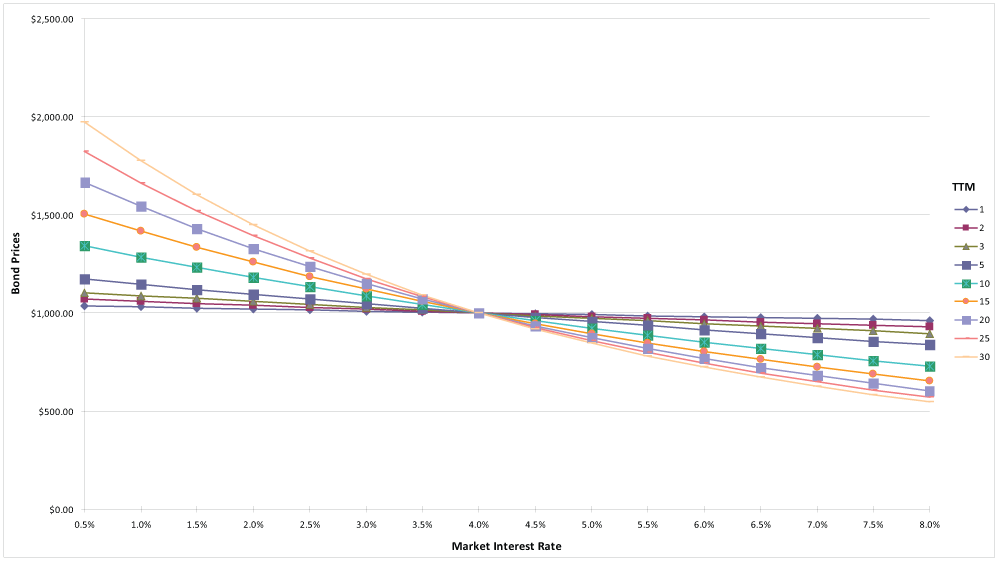 Maturity date is the second important factor affecting the degree of price volatility. The longer the time before a bond matures, the more sensitive its value will be to interest rate changes. The relationship is illustrated in Figure 1 for 4% coupon bonds of several different maturities. Since bond values change inversely to the change in interest rates, a long-term, low-coupon-rate bond will suffer a very great decrease in value when interest rates increase; conversely, a short-term, high-coupon-rate bond will change relatively little in value. A longer time to maturity means that it will take longer for investors to recover their initial investment, so the market value of the bond is more sensitive to changes in market interest rates.