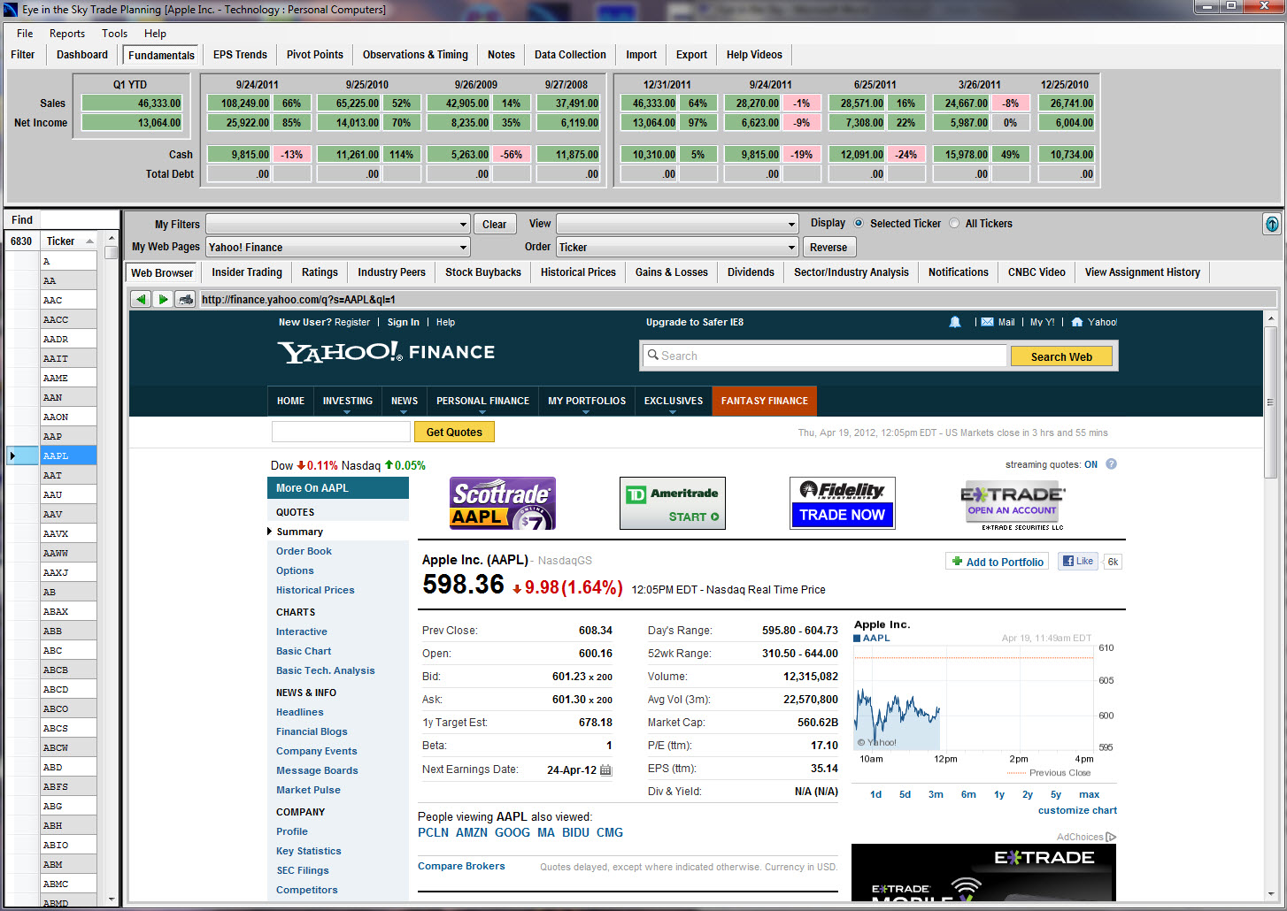 Eye in the Sky is useful right out of the box, as it offers fundamentals, EPS trends, pivot points, historical prices, ratings, insider trading updates, sector/industry analysis, and much more for nearly 7,000 stocks from the AMEX, the NASDAQ and the NYSE. Though much of this information can be found online for free, Eye in the Sky’s easy-to-navigate framework makes finding this information convenient and efficient.