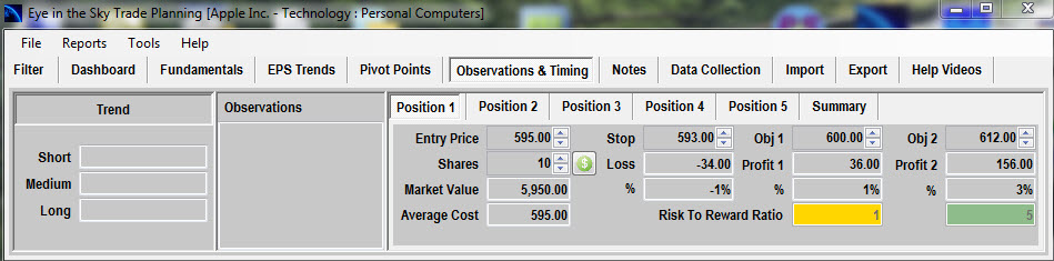 To truly utilize the program, users should take advantage of Eye in the Sky’s exceptional customizability. Users can build focus lists using hundreds of technical and fundamental screening criteria. To plan trades within a focus list, the program also provides an advanced trade planning feature, Observations & Timing, which allows the user to enter five positions for each stock. Each position can have its own trade criteria, such as entry price, risk-to-reward ratio, and market value. The user can then sort the focus list using the criteria in a position.