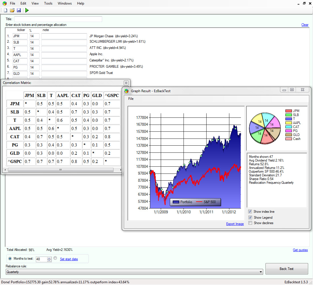 EzBacktest is a free backtesting program that shows investors the importance of diversification and helps them optimize their portfolio’s asset allocation for a desired risk and return. The program can backtest rebalancing rules, create a correlation matrix, calculate the risk and return of a portfolio using the Sharpe ratio and standard deviation, and more.