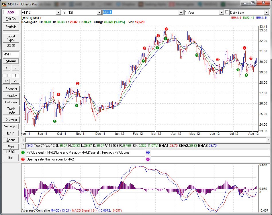 Fortunately, charting becomes much easier once everything is set up. One charting feature that is particularly useful to every investor is the ability to record actual buys and sells, target buys and sells, breakeven points and stop-loss lines directly on a chart. This makes it much easier for investors to determine when it is time to buy into or sell out of a position. Custom indicators are another distinct feature that allows users to create their own indicators and have them plotted on the graph when triggered. For instance, instead of studying indicators for each stock, users can add the signal criteria as a special indicator, which will display a number between one and four on the graph to mark when the indicator was triggered.