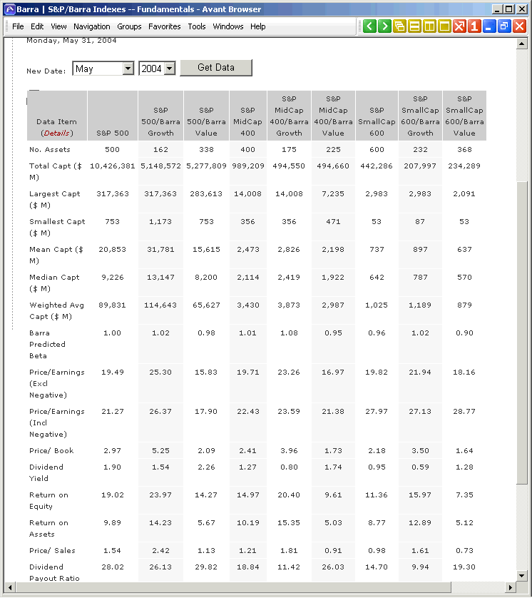 With Reuters.com and Wall Street City screeners, relative comparisons are not available so we set “absolute levels” for the current dividend yield. In setting up the dividend yield screen with both of these services, we required a minimum dividend yield of 1.9%. We chose this level because it was the yield of the S&P 500 on May 31, 2004, as calculated by Barra (Figure 4). Barra presents a number of useful benchmark statistics at its Web site (www.barra.com).