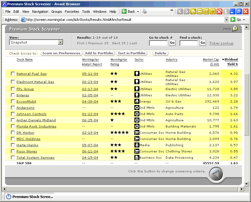Again, we were forced to alter our screen to fit the offerings of each of these on-line screening services. Two of the services—Morningstar Premium Stock Screener and MSN’s Deluxe Screener offer the ability to screen for yields relative to some benchmark. Using MSN’s screener, we screened for current dividend yields equal to or above the company’s five-year average yield. With Morningstar, we required the current dividend yield to be greater than or equal to the sector average.