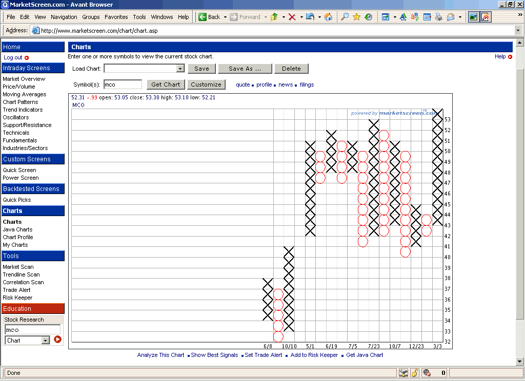 This site also uses high/low prices to create its point and figure charts. However, comparing the Moody?s point and figure chart from MarketScreen in Figure 6 to that of StockCharts.com in Figure 3 and the point and figure chart created manually in Figure 1, you can see that they all differ slightly, irrespective of the differing time frames. While they all use high/low prices, there is obviously room for interpretation when creating such charts. Keep this in mind when viewing different point and figure charts for the same security.